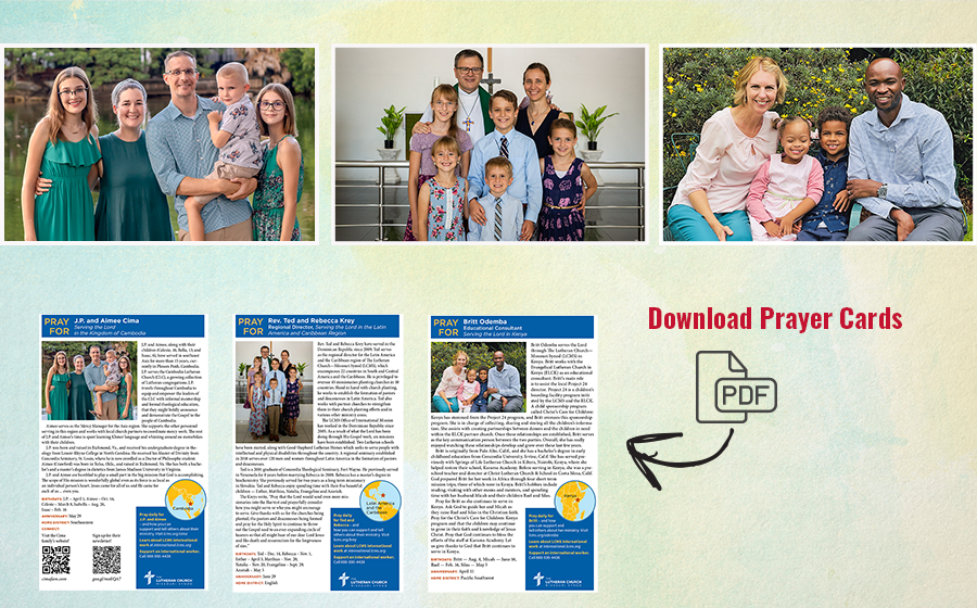 Downloadable prayer cards are easy-to-print documents with background information, prayer requests, and giving information for missionary families and individuals serving the Lord through The Lutheran Church—Missouri Synod.