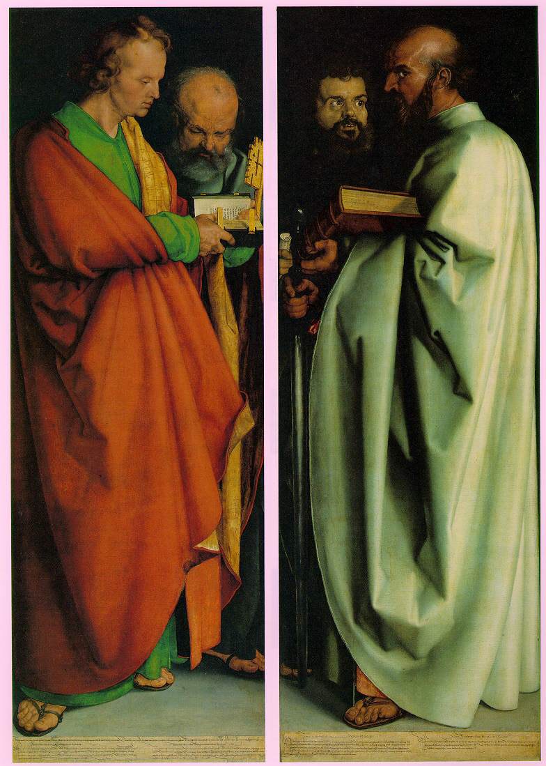 On March 17, 1525, the city council of Nürnberg voted to sever all ties with Rome and the pope. This Bavarian city, located in Franconia, quickly transitioned to Lutheranism. Relics were no longer paraded through the streets, convents and monasteries were confiscated, the Lutheran liturgy was sung, Lutheran sermons were preached, and not only were both the body and blood of Christ distributed in the Lord’s Supper, but it was also forbidden to teach that it was merely a symbolic communion. It is in this Lutheran context that Albrecht Dürer produced his greatest, his last, and his most powerful painting, The Four Holy Men.