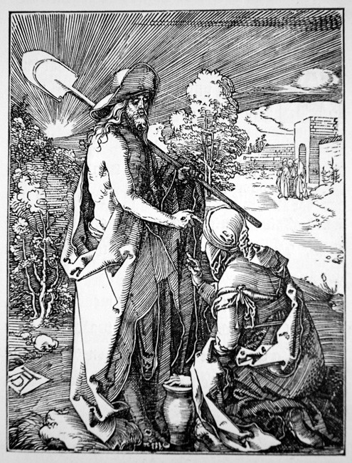 Albrecht Dürer’s first Easter woodcut proclaims the glorious power of Christ’s resurrection, while the second shows the earthy humanity of our risen Savior. The distinctive “AD” monogram lies flat on the ground inviting you to kneel in worship with the Renaissance artist. “This charming print is probably the most recognized and loved of all of the woodcuts in Albrecht Dürer’s Small Passion.  It is early on Easter morning. The sun’s first rays illumine the Risen Lord as Mary Magdalene kneels before Him. Dressed as a gardener, Christ’s resurrection ushers in the new creation. He holds a shovel over His shoulder; the work is done. The sin in the Garden of Eden has been paid for on the cross by the Second Adam. He is the obedient, perfect Gardener.”[2]