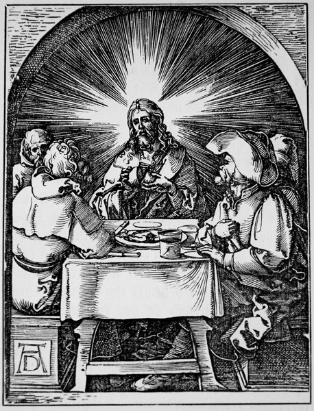 Dürer’s Small Passion closes Easter Day with the evening meal at dusk. “The Emmaus woodcut captures the stunning moment of faith’s recognition of the Savior. Jesus is the host at the meal. His presence brings forgiveness, life, and salvation. These gifts were destroyed at the first meal in the Garden of Eden. Just as the nail-pierced hands of Jesus are breaking the bread, the eyes of Cleopas, dressed as a Renaissance traveler, are opened. He clutches his heart. It is the Lord!  The Risen Lord! Suddenly all the truths of Scripture their traveling companion had taught them on the afternoon’s walk become crystal clear. Although the Lukan narrative mentions only two people, the artist has inserted several others in the background, providing a foretaste of the Holy Christian Church, where many will gather in the real presence of Christ. Dürer leaves space at the end of the small table for you to join in the supper. He is also present, for his monogram is on the bench, as well as in the table legs and cloth.”[3]