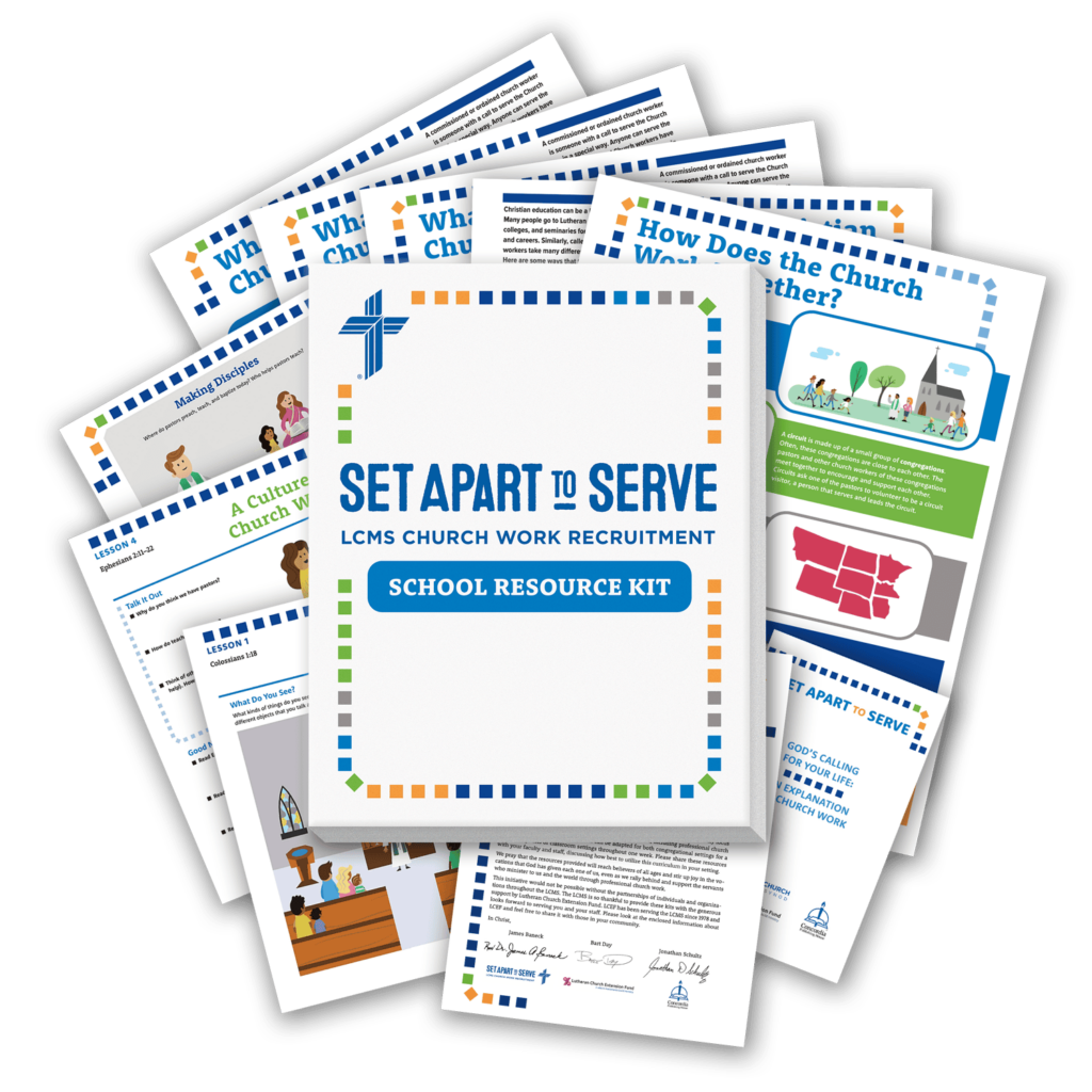 Set Apart to Serve (SAS) is a Synodwide effort to build an intentional culture of church work formation and recruitment in every LCMS congregation, family, school, district and entity. Together, we pray that the Lord of the harvest will supply His church with pastors who preach and teach the Gospel of Jesus Christ and commissioned church workers who will teach and share God’s Word in their full-time church work vocations.