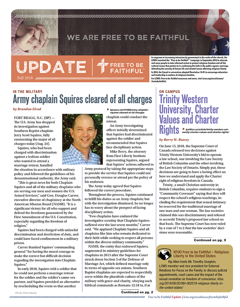 If you would like to stay informed on issues related to marriage, life, religious freedom or the establishment of the Lutheran Center for Religious Liberty, please send your name and address to freetobefaithful@lcms.org.
