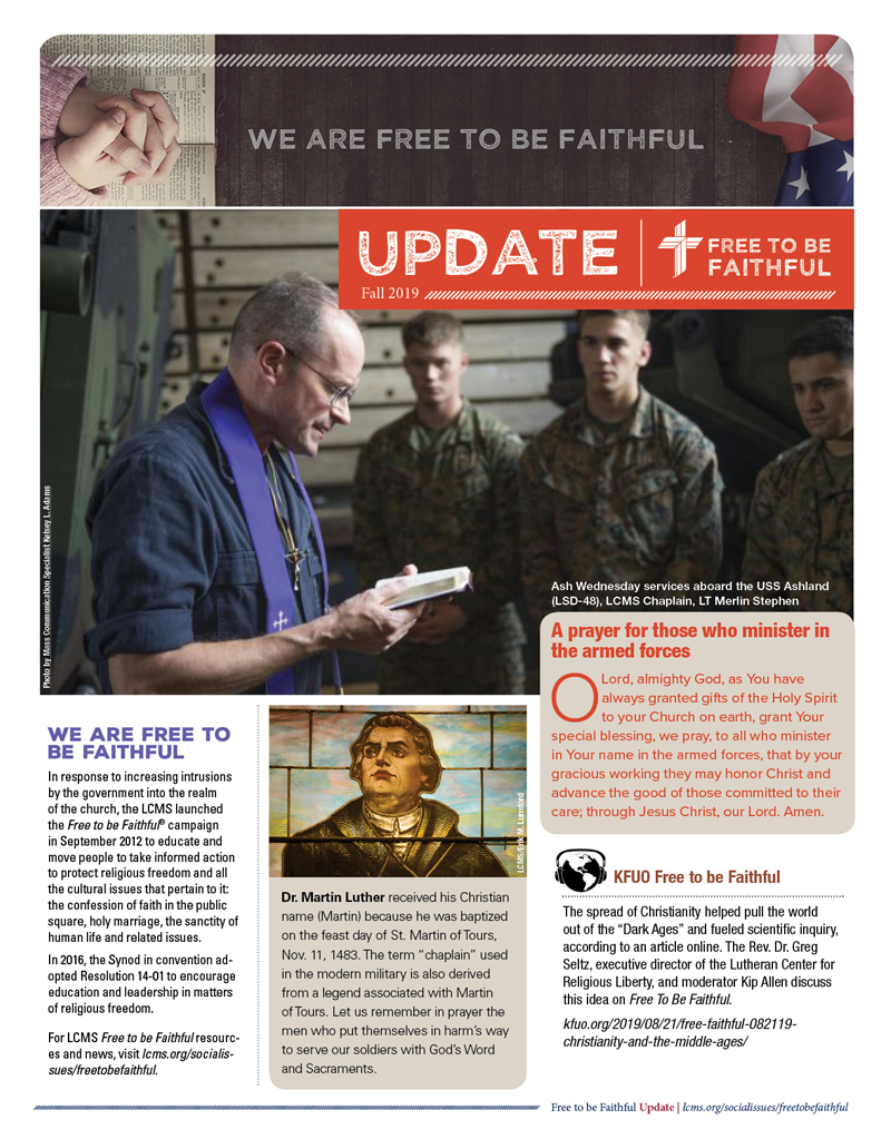 If you would like to stay informed on issues related to marriage, life, religious freedom or the establishment of the Lutheran Center for Religious Liberty, please send your name and address to freetobefaithful@lcms.org.