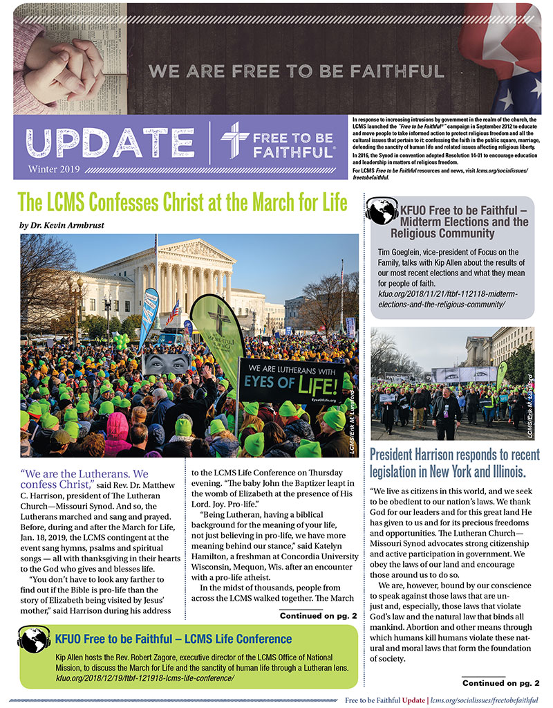 • The 2019 March for Life and the LCMS Life Conference that focused on confessing God’s truth about the sanctity of human life.