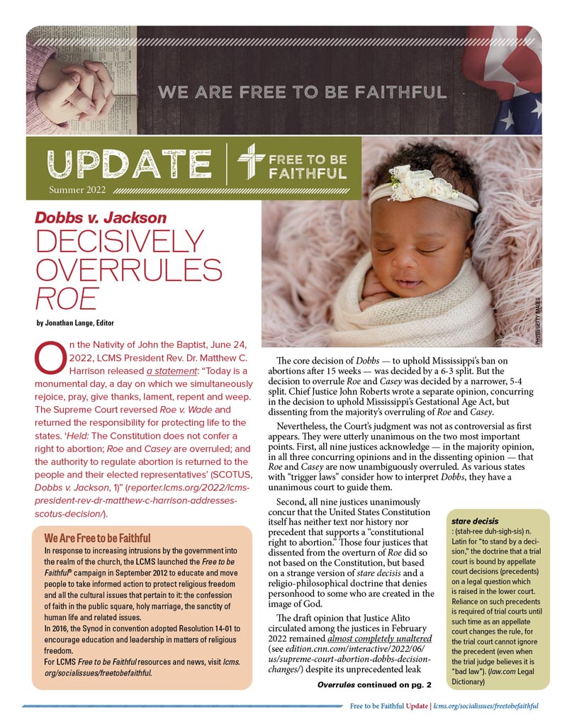 If you would like to stay informed on issues related to marriage, life, religious freedom or the Lutheran Center for Religious Liberty, please send your name and address to freetobefaithful@lcms.org.