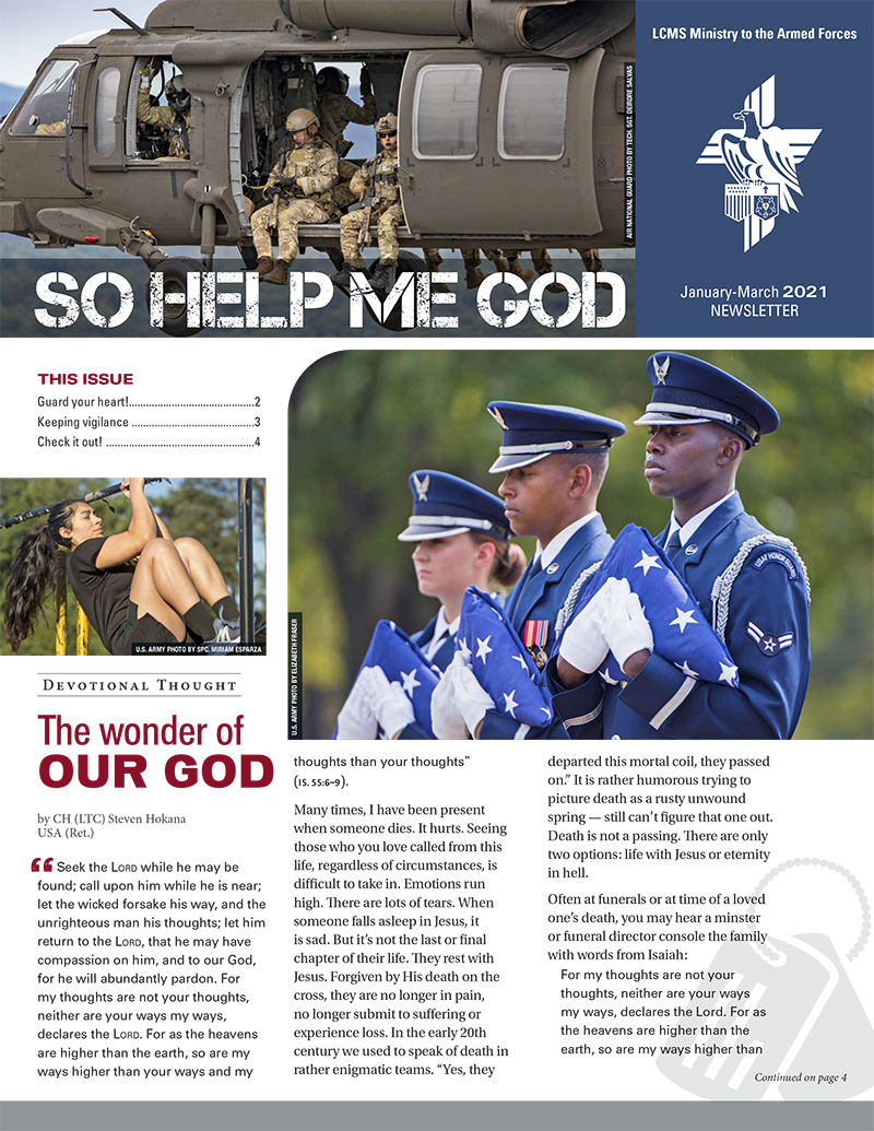 In this issue of So Help Me God, the newsletter of LCMS Ministry to the Armed Forces, readers are encouraged to consider the wonder of God and His love for us. God has transformed and redeemed our hearts, which we should guard through His Word.
