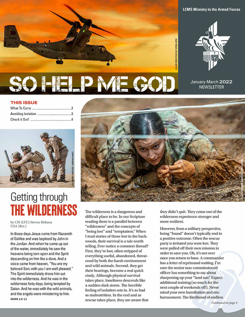 In this issue of So Help Me God, the newsletter of LCMS Ministry to the Armed Forces, readers are encouraged to remember the promise that the Lord is with us, while we are in the wilderness and always.