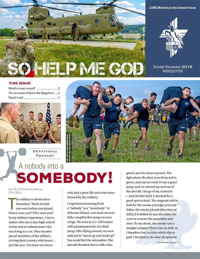This issue of the So Help Me God newsletter from the LCMS Ministry to the Armed Forces highlights the redemptive, transformative change that occurs in Christ Jesus.