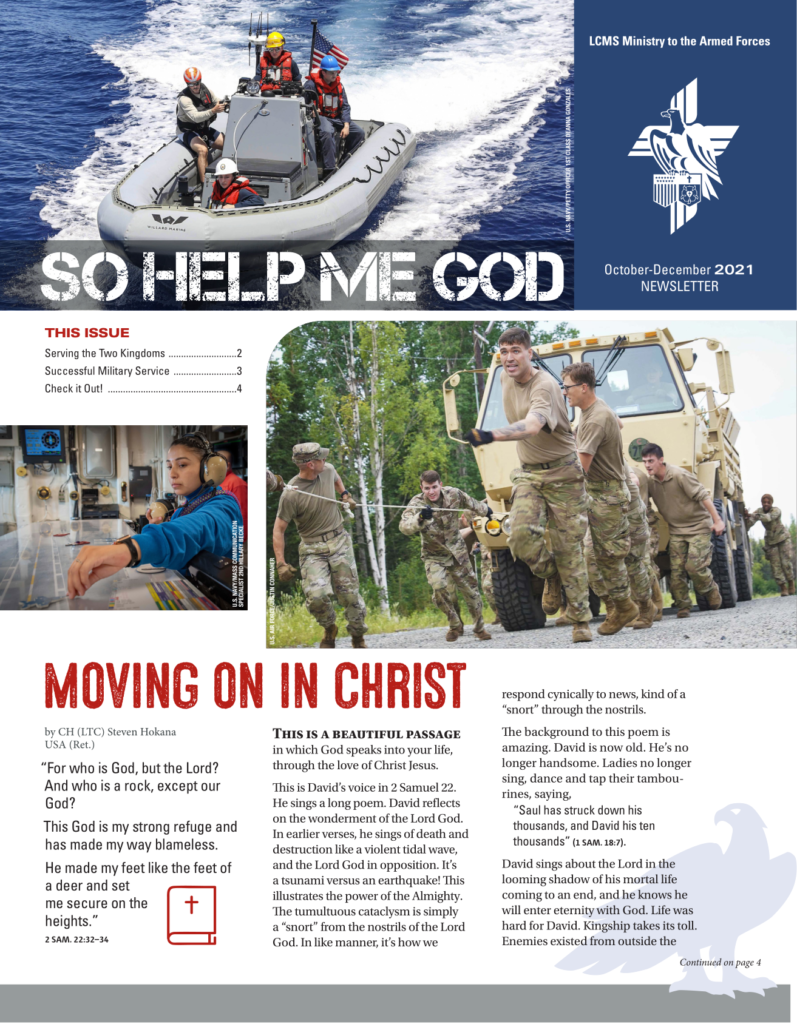 In this issue of So Help Me God, the newsletter of LCMS Ministry to the Armed Forces, readers are encouraged to see war through the lens of God’s hand in our lives, knowing He is with us during challenging chapters and He saves us to live with Him forever.