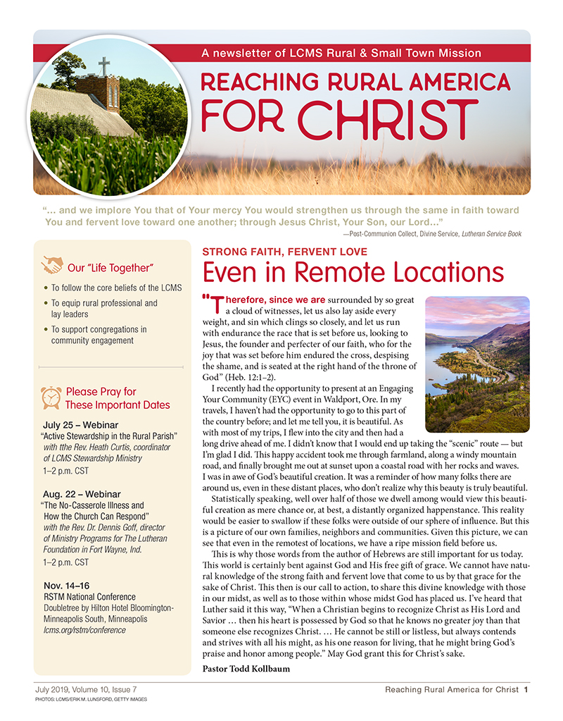 The July 2019 issue of Reaching Rural America for Christ highlights what really works for stewardship in the rural parish (or in any parish, really): putting God’s Word first, finding stewardship’s place in the Christian life and in the work of pastors, and teaching how to support the Lord’s work in a faithful way.