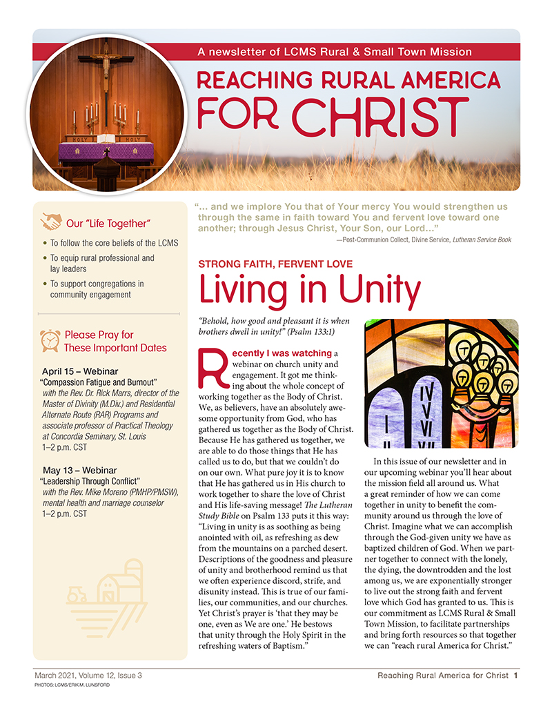 The March 2021 issue of Reaching Rural America for Christ, the newsletter from LCMS Rural & Small Town Mission, reminds us of the opportunities God gives us to work together in unity to benefit our communities through the love of Christ.