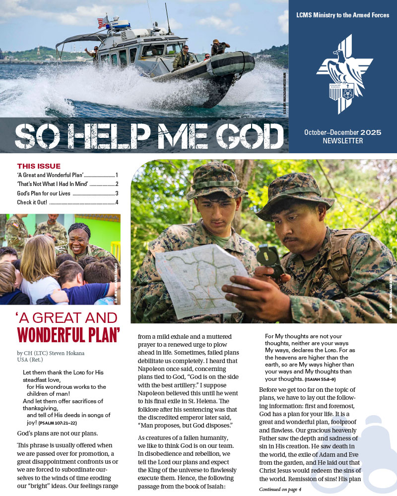 This issue of So Help Me God, the newsletter of LCMS Ministry to the Armed Forces, focuses on the goodness of our Lord in executing His will in our lives.