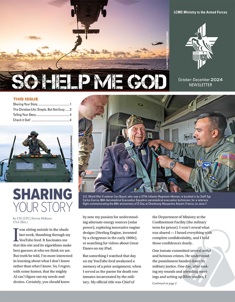 This issue of So Help Me God, the newsletter of LCMS Ministry to the Armed Forces, discusses how to share your story of faith in Christ with others.