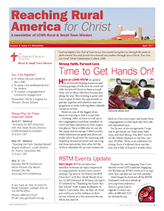 • re:Vitality for Rural and Small Town Congregations” free webinar presented by Rev. Mark Wood, director, LCMS Witness & Outreach Ministry – Thursday, April 27, from 1 to 2 p.m. Central time. Visit lcms.org/rstm if you are interested in participating.
