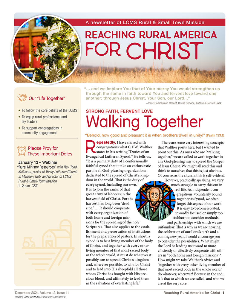 The December 2021 issue of Reaching Rural America for Christ, the newsletter from LCMS Rural & Small Town Mission, reminds us we are called to walk and work together in a God-pleasing way to spread the Gospel of Jesus Christ.