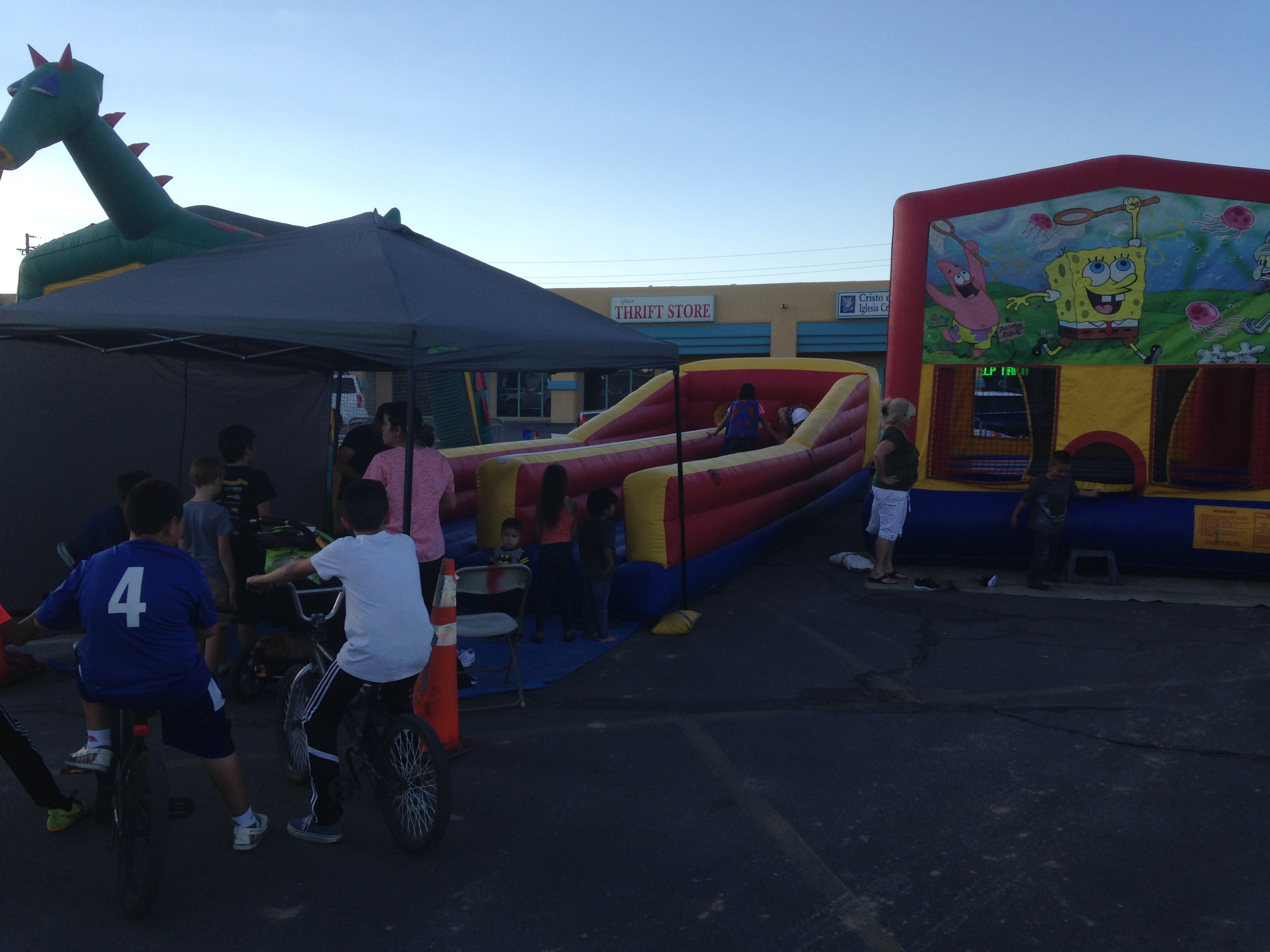 IMG_1682   At the event, some of the local businesses and several local neighborhood people helped to grill food. They thought it was good for all to work together for the good of the neighborhood, and they served up over 120 hamburgers and 250 hot dogs. Exhibitors came to the night out: New Mexico Healthcare organization, a local dentist, and a small business owner from the neighborhood. St Andrew had a table for VBS registration.