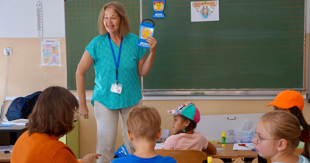 Denise Lewis demonstrates the craft for day one of an English Bible Camp in Słupsk, Poland, in July 2022. The camp focused on Jesus’ statement “I am the light of the world.” (Photo by Ben Helge)