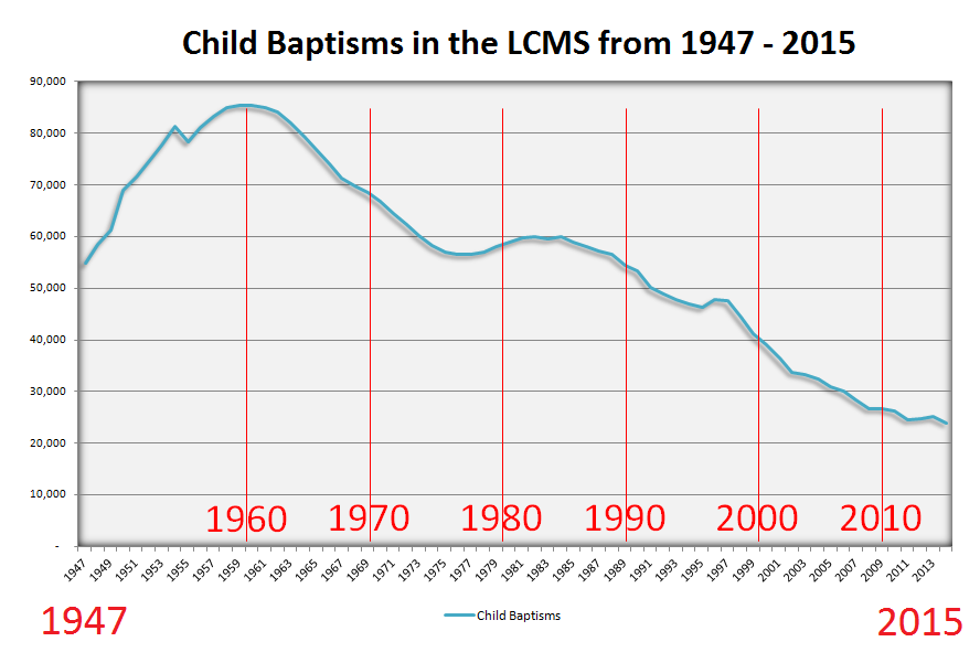 As this has been happening, Ryan Curnutt of LCMS Research has been identifying trends surfacing within the LCMS self-reporting system. Ryan reported on these numbers to the LCMS Council of Presidents and others in September. I used the findings as the backdrop to a presentation at Concordia Seminary’s Symposium in September, focusing on retention rates of the baptized.