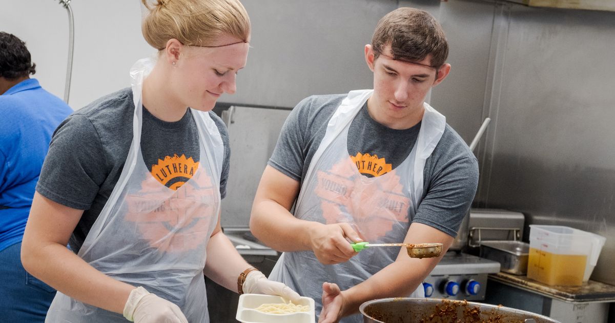 Lutheran Young Adult Corps participants Courtney Haag and Hayden Duncan prepare food for volunteers at Camp Restore in New Orleans in 2018. (LCMS Communications/Erik M. Lunsford)
