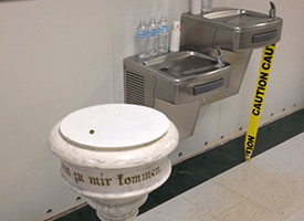 A water fountain with caution tape across it, because there are toxins in the city’s water supply. Sitting on the fountain are bottles of water that are safe to drink. The bottles were leftovers from a 6-year-old girl who was handing them out in the neighborhood surrounding the church the day before. And beside the fountain is an old baptismal font pulled out of storage while they work in the storage room where it was stored.