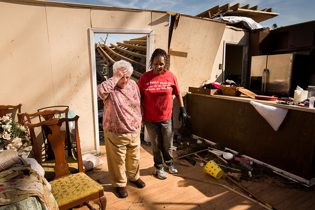 Connie Lambert (left) reacts after returning to her damaged home in Tupelo, Miss., on Friday, May 2, 2014. A tornado ravaged the community earlier in the week. LCMS Communications/Erik M. Lunsford