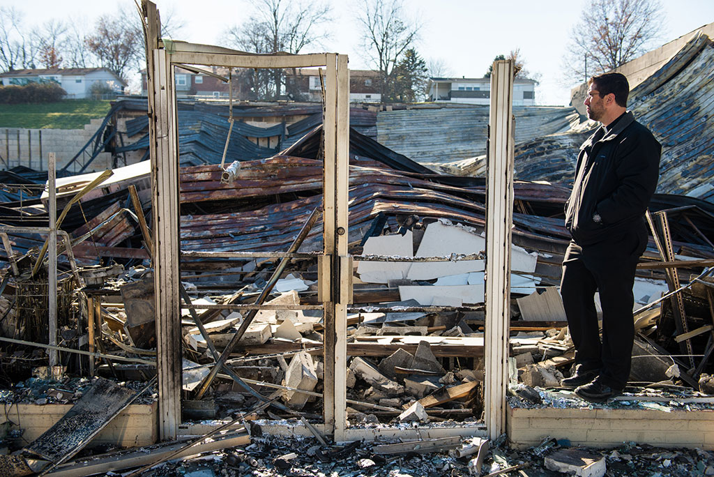 The Rev. Ross Johnson, director of LCMS Disaster Response, surveys the debris of the Family Dollar Store on Halls Ferry Road on Tuesday, Nov. 25, 2014, in St. Louis. The building caught fire the previous night following a grand jury decision not to indict Ferguson Police Officer Darren Wilson in the shooting death of Michael Brown. LCMS Communications/Erik M. Lunsford