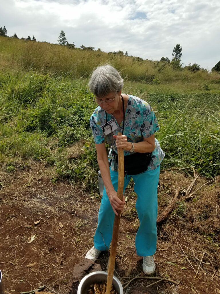 Bonnie Hartman stirs a pot at the outside kitchen with the Ugandan church ladies who made lunch for the medical staff and American volunteers every day (about 50 people).