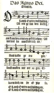 The text of “Lamb of God, Pure and Holy” appeared with “All Glory Be to God on High” in the publications listed previously. It first appeared with the tune that is currently associated with it, O Lamm Gottes, unschuldig, in Anton Corvinus’ Christliche Kirchen-Ordnung (Erfurt, 1542). It was adapted by Decius from a thirteenth-century, or possibly earlier, “Agnus Dei” plainsong for the feast of the Blessed Virgin. This meaningful hymn is frequently used during midweek Lenten services and on Good Friday. In the Chief Service for Good Friday in Lutheran Service Book, each successive stanza is sung following each reproach of Jesus from the cross and response of the people. J.S. Bach used this solemn melody in his St. Matthew Passion, Choralgesänge, as well as setting for organ in the Orgelbüchlein (little organ book) and The Great Eighteen Chorales.